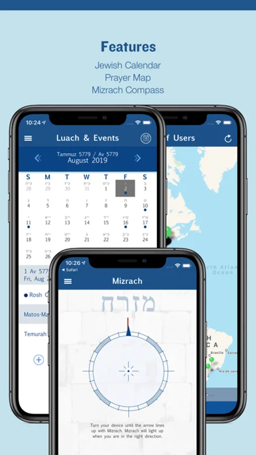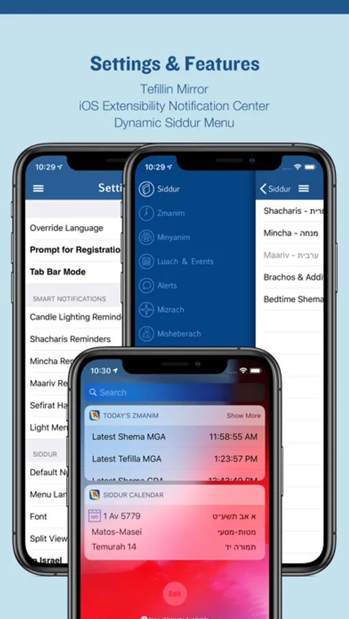 קחו את הסידור העמוס בתכונות לכל מקום. תוכלו לקבל גירסאות תפילה בנוסח אשכנז, ספרד, עדות מזרח ונוסח האר"י (חב"ד). הסידור כולל תפילת שחרית מנחה וערבית לימות החול, ברכות ועוד. זמני תפילות לכל יום לכל מקום בהתאם לGPS של מכשיר האי פון. מסד נתונים של מנינים יאפשר לכם לאתר בית כנסת הקרוב אליכם. לוח שנה עברי יסייע לכם עם זמני תפילה. מצפן "מזרח" יגלה לכם לאיזה כיוון להתפלל מכל מקום (בדגם 3GS בלבד).
