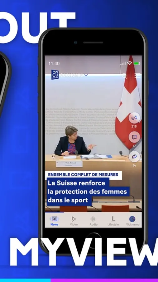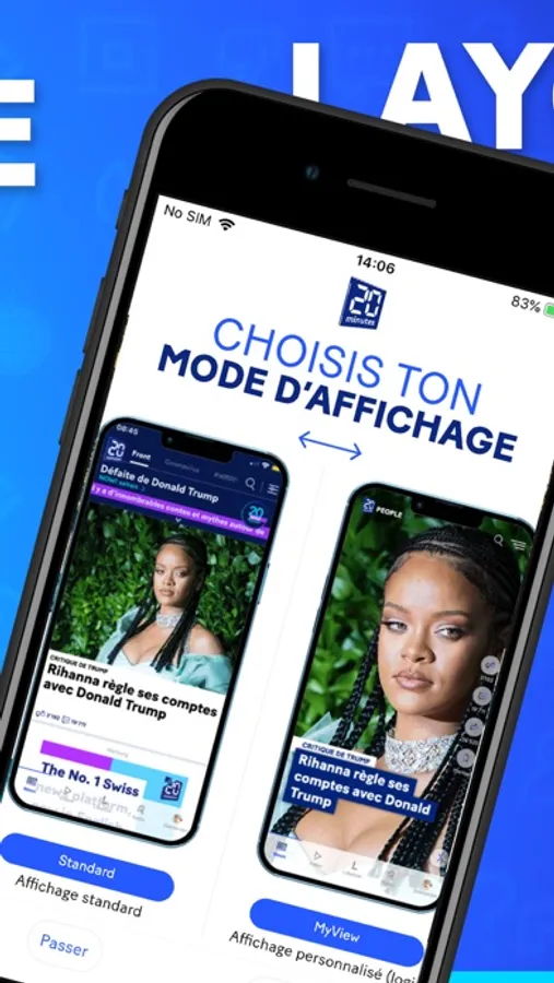 En plus du mode d’affichage standard qui contient les news essentielles du monde entier 24h/24, tu peux personnaliser ton feed d’actualité selon tes centres d’intérêt grâce à «My View». En appuyant longuement sur le bouton ”News” en bas à gauche, tu peux changer ton mode d’affichage à tout moment (“Standard” ou “MyView”). Toutes les autres infos sont disponibles dans les rubriques en haut de l’interface.