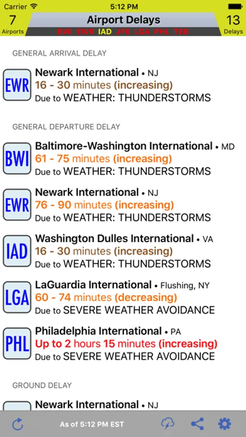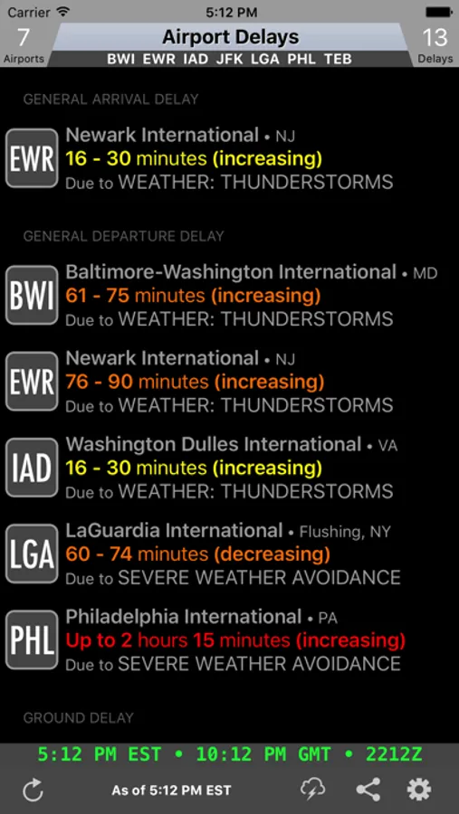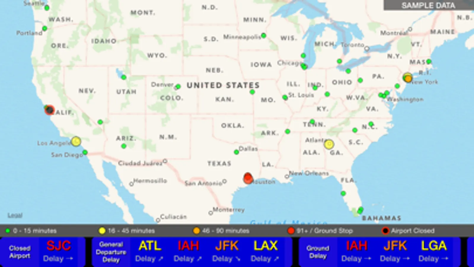 FAAwait provides real-time access to current air traffic delays at all U.S. airports. It utilizes a data feed maintained by the FAA that tracks departure and arrival delays, ground stops, and ground delays. To access this information, an active internet connection (WiFi or cellular) is required.