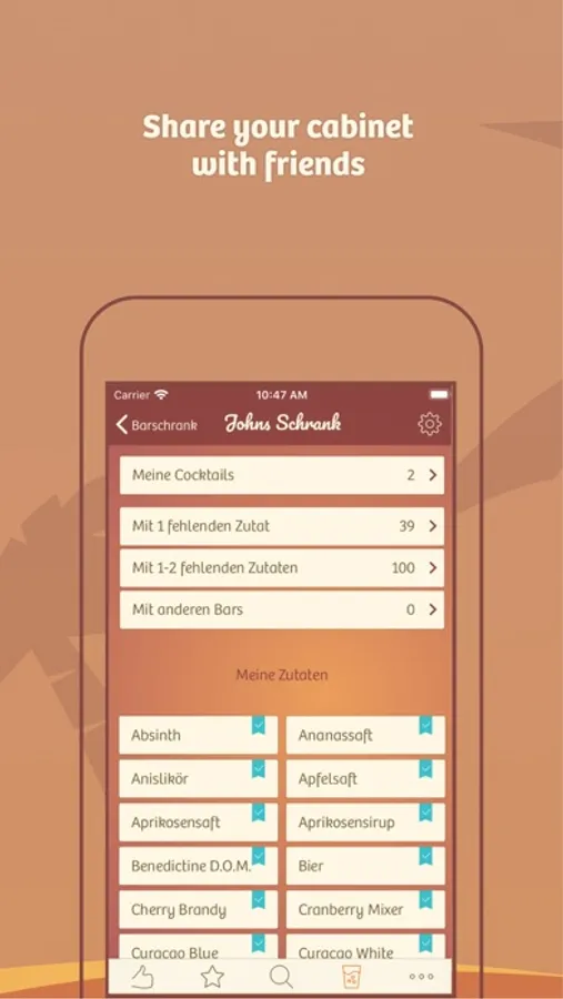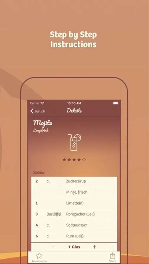 Every cocktail has a detailed description and a ingredients list. There are no Ads.