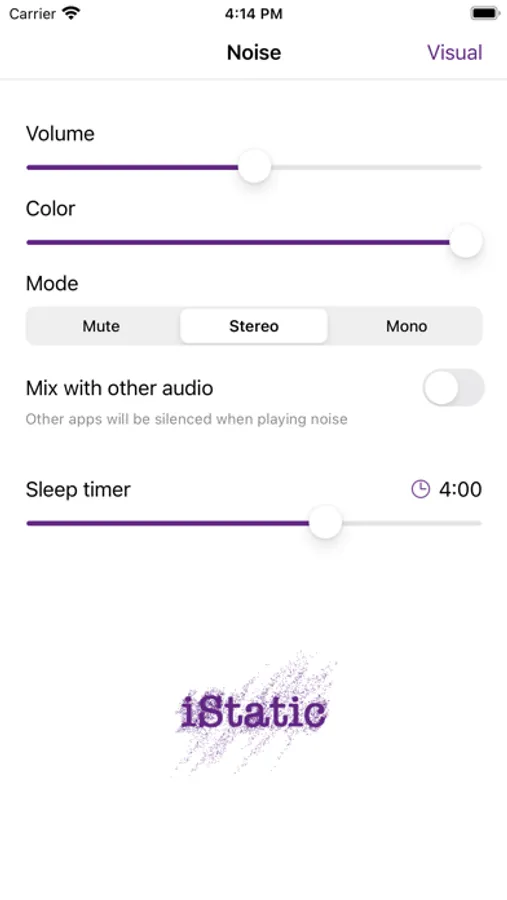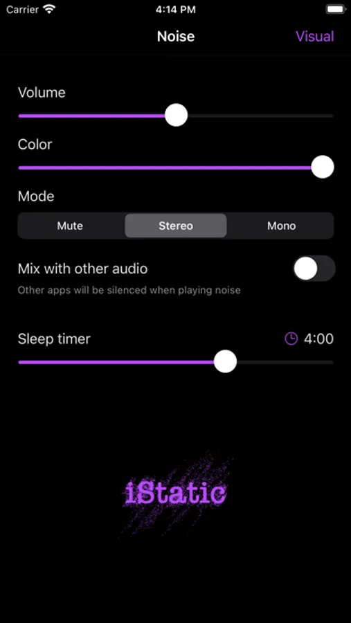iStatic generates continuous visual and aural noise. Use it to mask distracting background sounds, when you're at work, reading on the train, trying to sleep, or if you just loathe silence.