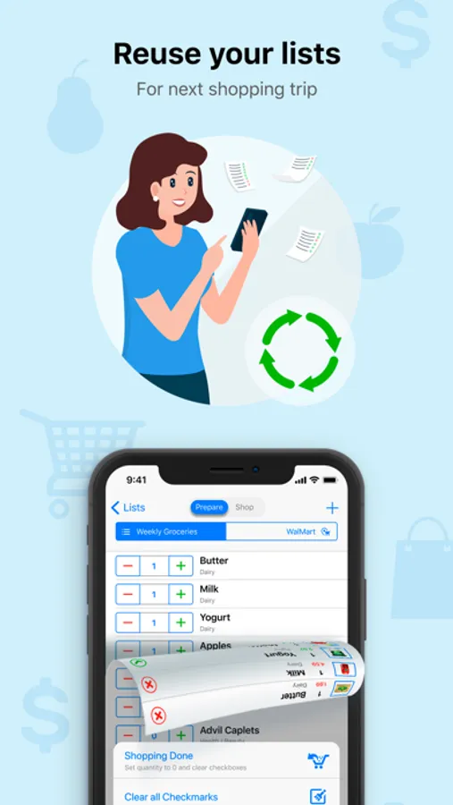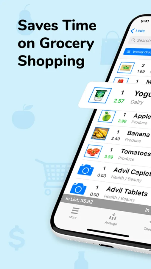 Save time and money. Be organized at home and efficient at the supermarket. Stop rebuilding shopping lists – just reuse them. Stop calling your spouse - share via sync.