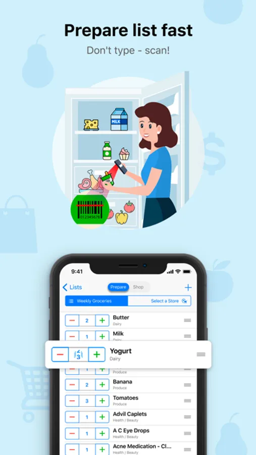- Don’t type – scan barcodes or use built-in list of frequent items