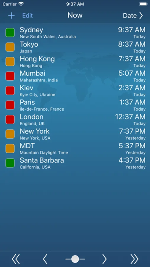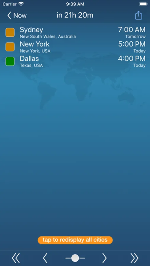 Initially, the current times for your chosen cities are shown, with color coded icons quickly showing if now is a good time to call. If not, a drag on the "TimeScroller" button will rapidly advance the times to find a more suitable time later in the day.