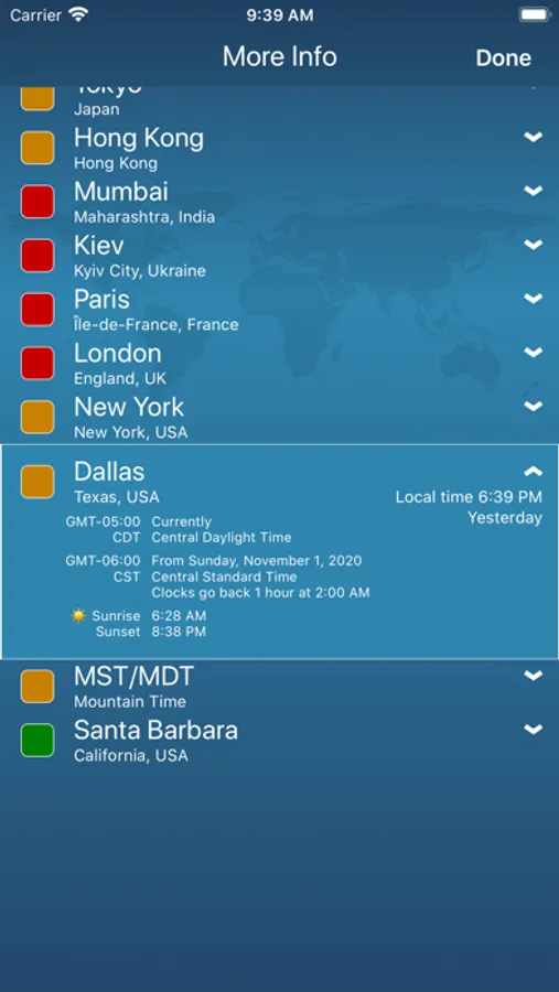 * Information page for city includes the date and time of next daylight savings change as well as sunrise and sunset times