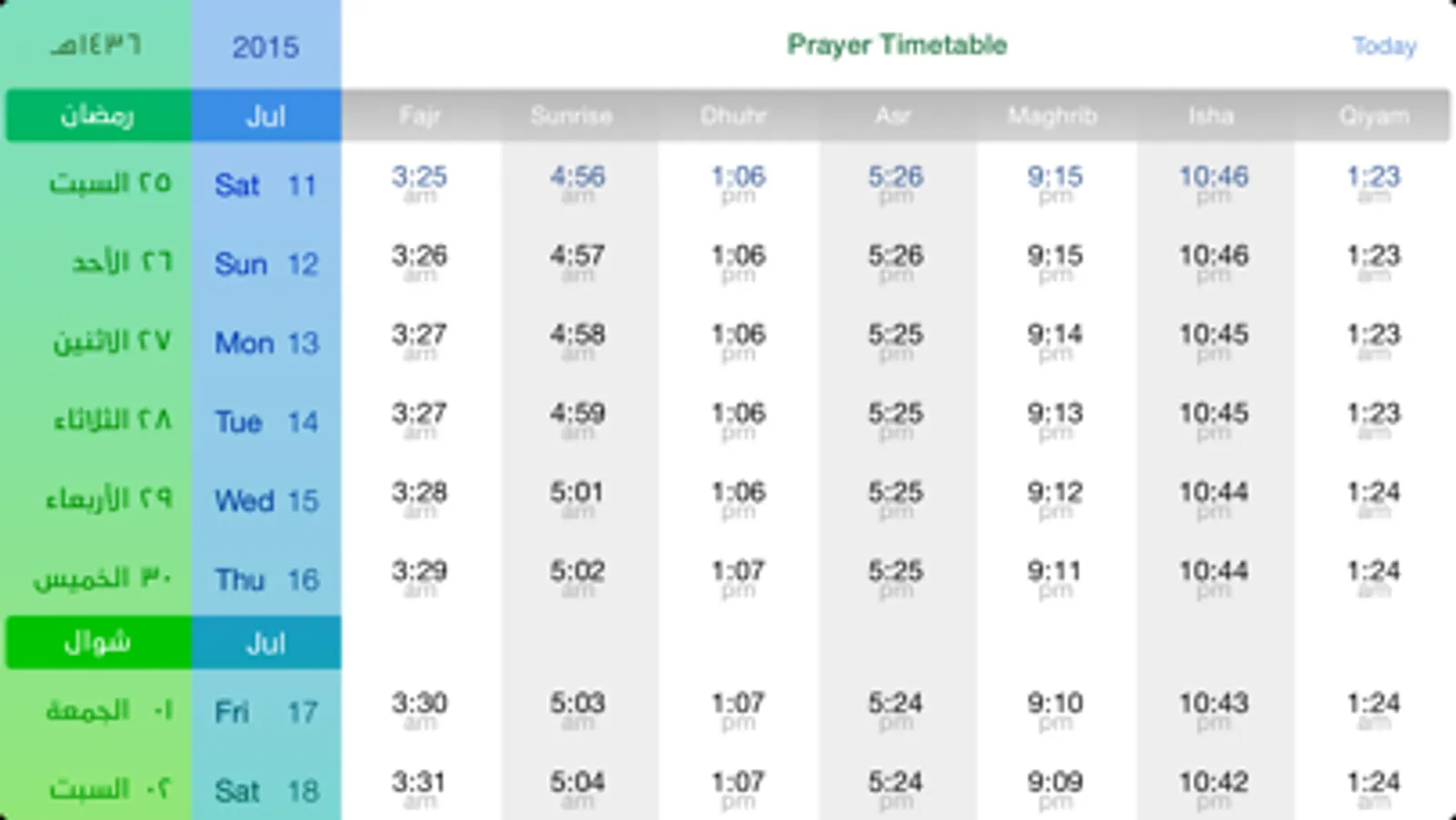 * Landscape Prayer Timetable. Turn your device landscape to see upcoming prayer times for the week / month / year. Best way to observe Ramadan monthly prayer times