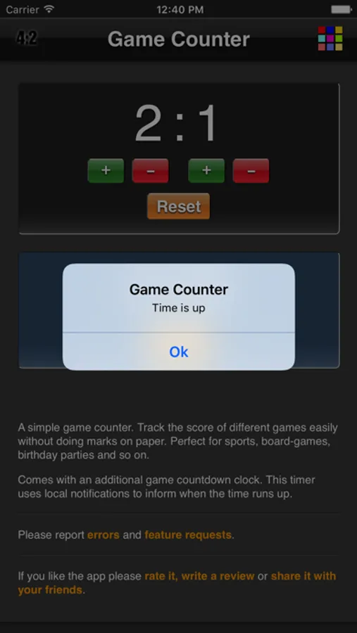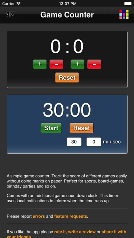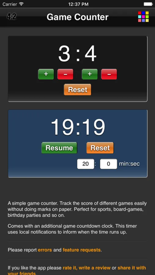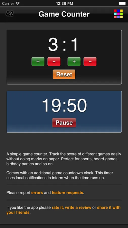 This is a game counter application. Track the score of different games easily without doing marks on paper. Perfect for sports, board-games, birthday parties and so on.