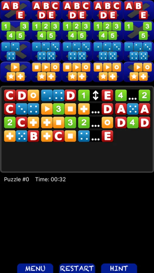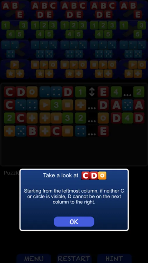There are four different types of clues: "In between", "Left of", "Same column" and "Next to". "In between" clue tells that the middle tile has to be located in between the other two. It however does not tell the order of the other two tiles or how far they are from the middle one. "Left of" clue tells that the left tile has to be located left of the right tile. It however does not tell how far apart they are. "Same column" clue tells that the two tiles have to be on the same column. "Next to" clue tells that the two tiles are adjacent to each other. It however does not tell the order of the two tiles.