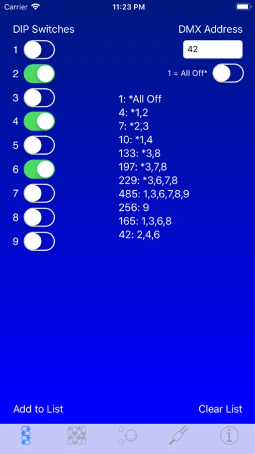 • Store a list of DIP switch settings for later entry to DMX devices.