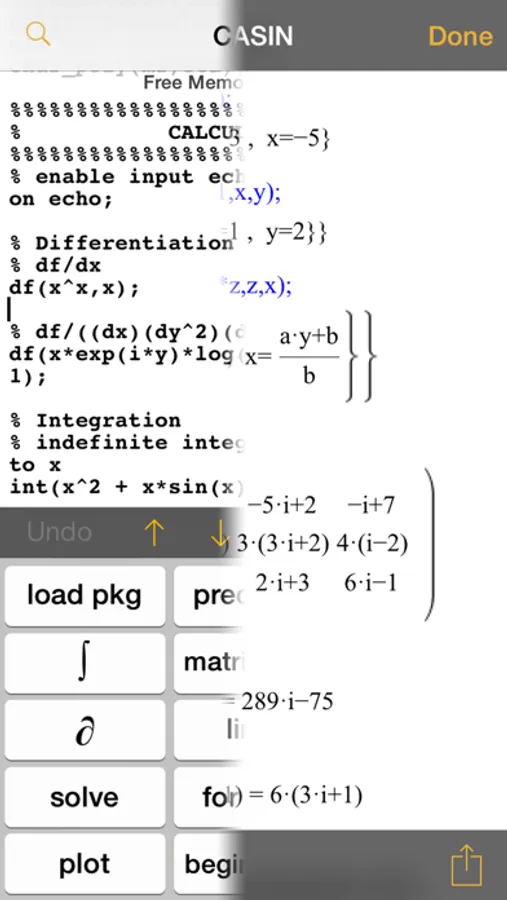 The i41CX+ CAS is a full implementation of REDUCE. It's like having Mathematica or the computational engine of Wolfram Alpha in your pocket and, best of all, it runs natively so no internet connection is required. The CAS is fully programmable and provides the ability to reuse previous results in computations. Moreover, the CAS has full access to the calculator registers so it is possible to combine RPN programs with CAS programs.