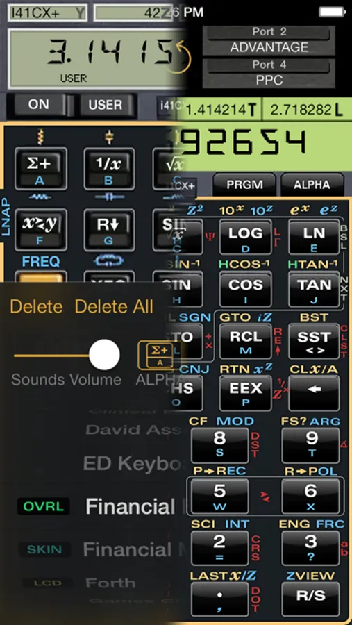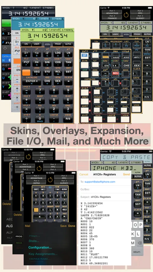 i41CX+ is an advanced programmable and expandable RPN scientific calculator with a virtual thermal printer/plotter and workstation-class CAS capabilities that is far beyond a mere replica of the original. In addition to being functionally equivalent to the world-renowned HP-41CX and providing access to its entire library of modules and programs, i41CX+ is enhanced with iOS and hardware features, keyboard overlays, rich set of import and export capabilities, traditional and upbeat diverse set of skins, complete color control, iCloud support, and much more.