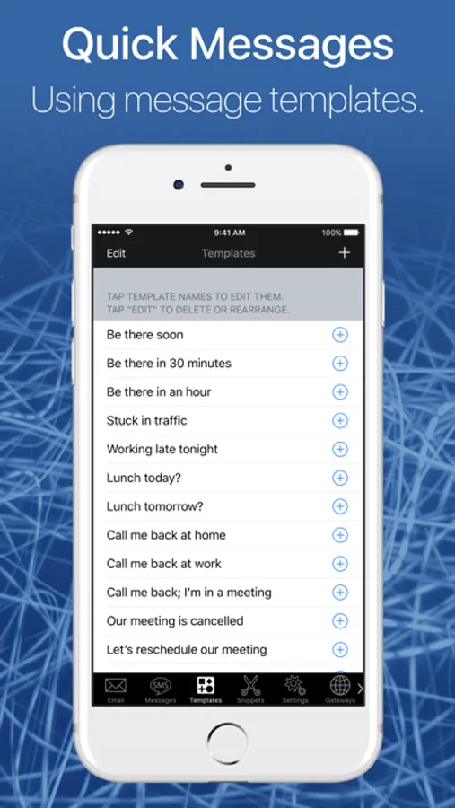 With Maildash on your iOS device, you can custom design your own stationery. If you don't see a message that fits the situation, just type your own personal template using the keyboard; or edit one of the pre-formatted phrases that have been included. Customizing your email has never been simpler. With the Template Editor, you can create your own unique phrases; and multiple formal and casual email signatures as well.