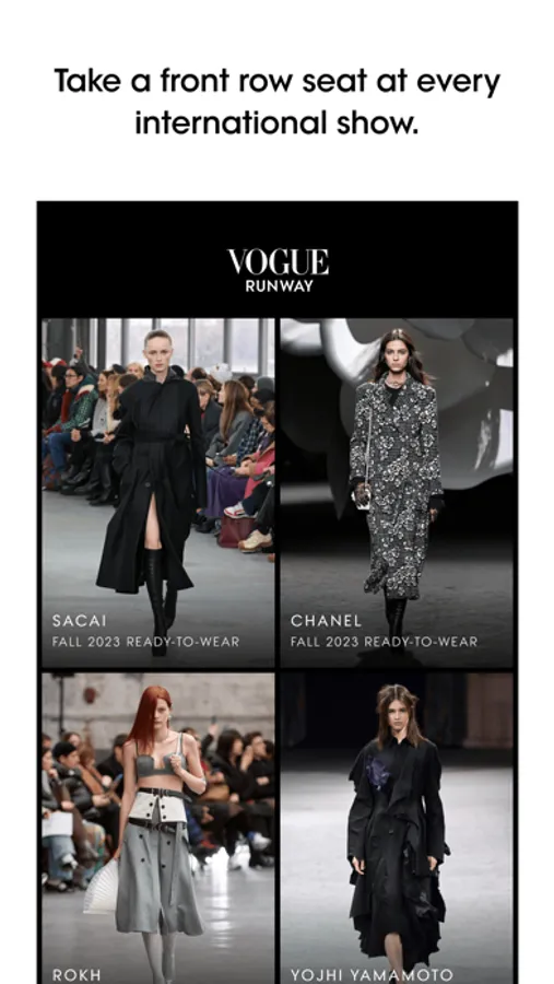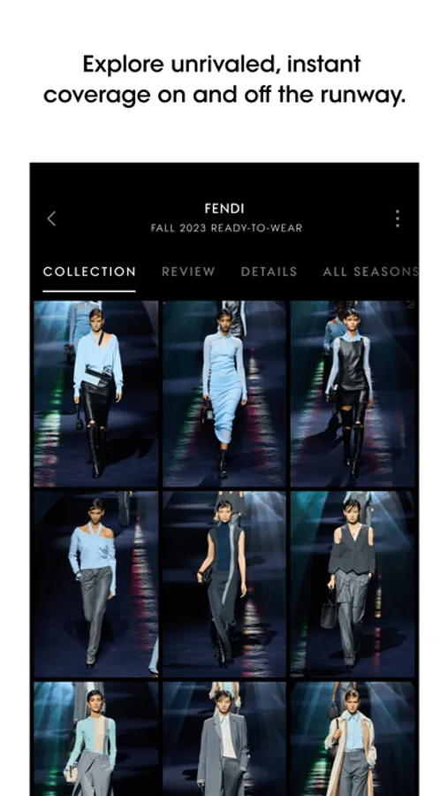 Explore unrivaled fashion coverage and unlimited access to runway shows around the world, from the global authority in fashion media. See runway shows from every angle: clips capturing the catwalk, collection close-ups and details, front row sightings, and backstage happenings.