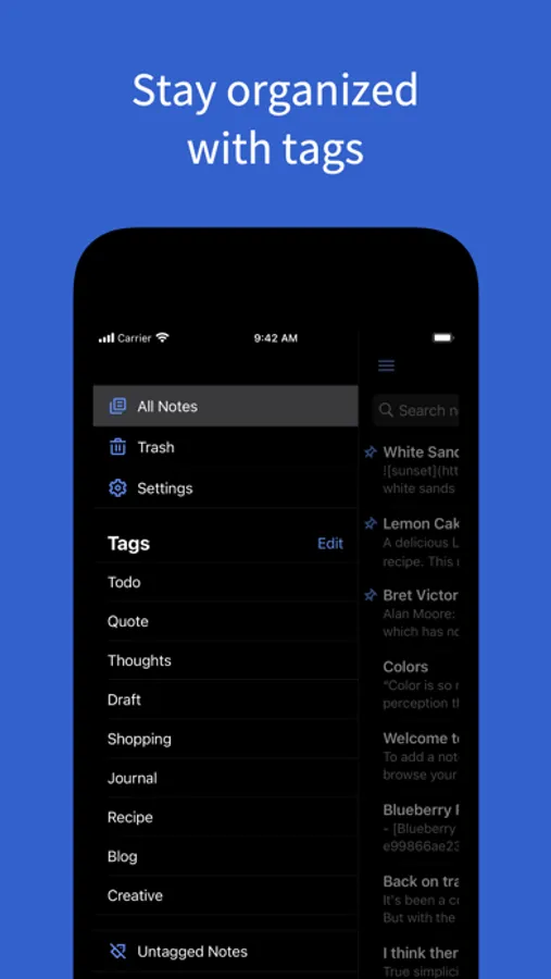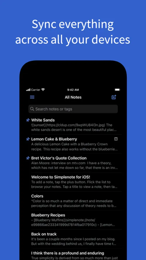 Simplenote is an easy way to take notes, create to-do lists, capture ideas, and more. Open it, jot down some thoughts, and you're done. As your collection grows, stay organized with tags and pins, and find what you need with instant search. Since Simplenote will sync across your devices for free, your notes are with you at all times.