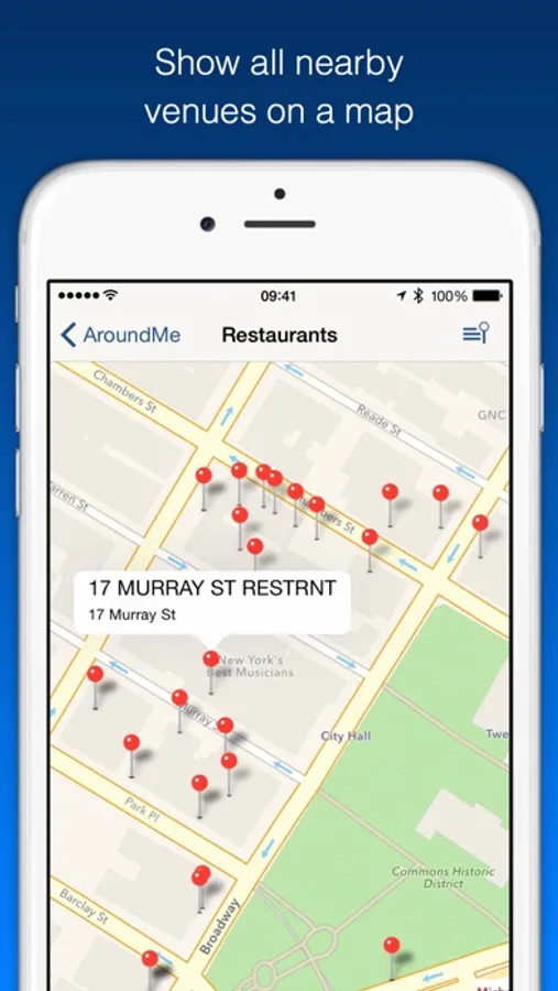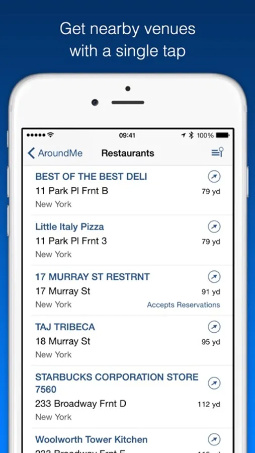 AroundMe shows you a complete list of all the businesses in the category you have tapped on along with the distance from where you are.