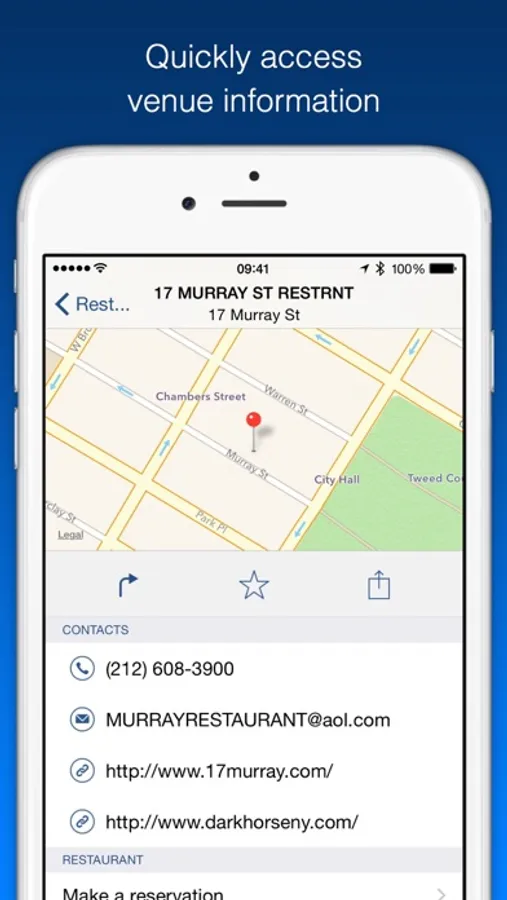 For every listing you can choose to see its location on a Map, view the route from where you are, add the information to your contact list or even email the information to a friend.