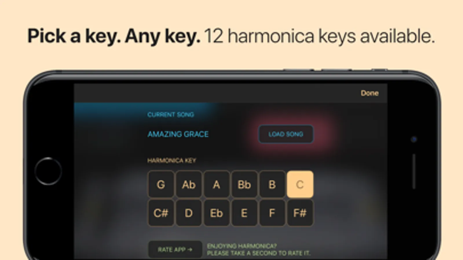 Harmonica features a genuinely-sampled 10-hole diatonic harmonica. Both single notes and chords are playable, as are “blow”, “draw”, and “bend” notes. Harmonica includes all 12 keys—it’s like having 12 harmonicas in your pocket!