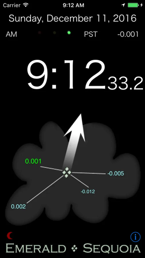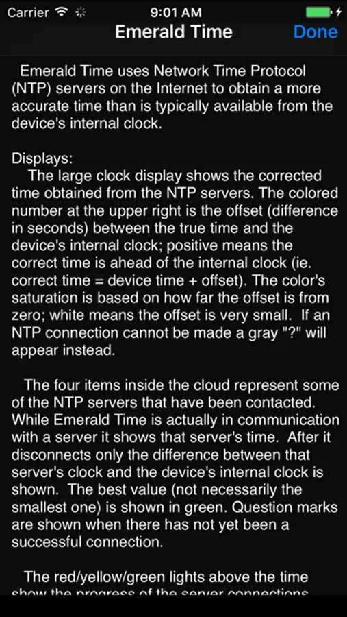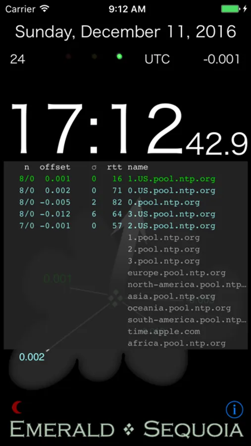 Emerald Time uses Network Time Protocol to display the current time of day as defined by the international standard atomic clocks. Its accuracy is limited only by network latency and is usually accurate to less than +/-100 milliseconds.