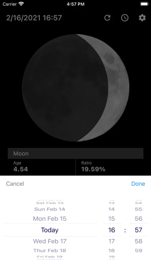 * Displays the dates of the Moon's new, first-quarter, full, and third-quarter phases