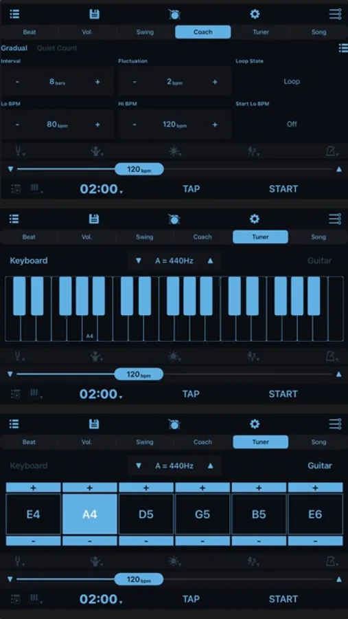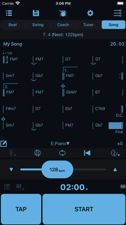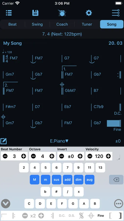 • Song Player—Create chord progression by typing chord name and play along with the metronome.