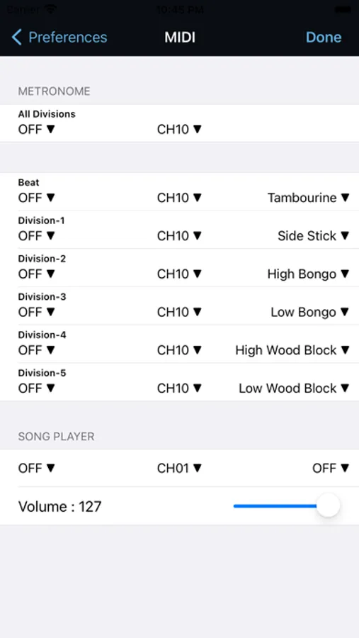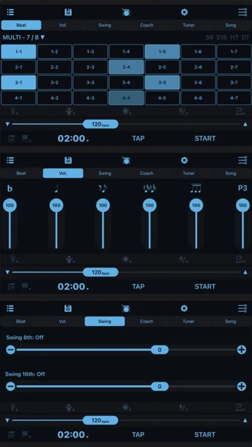• Multi beat mode—Set time-signature and number of bars to repeat. Select arbitrary beats to create complex rhythms. Velocity for each selected beats can be adjusted.