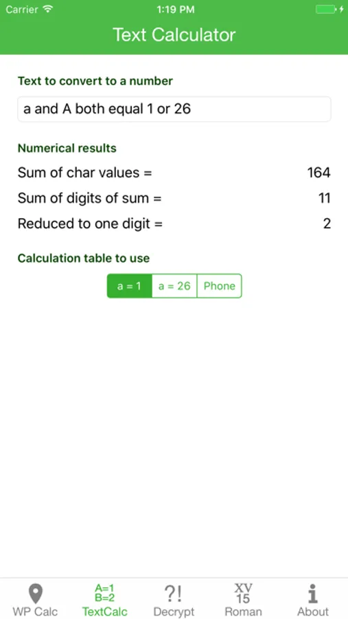 - Choose between a=1, b=2 etc., the inverse a=26, b=25 etc. or the phonepad abc=2, def=3 etc.