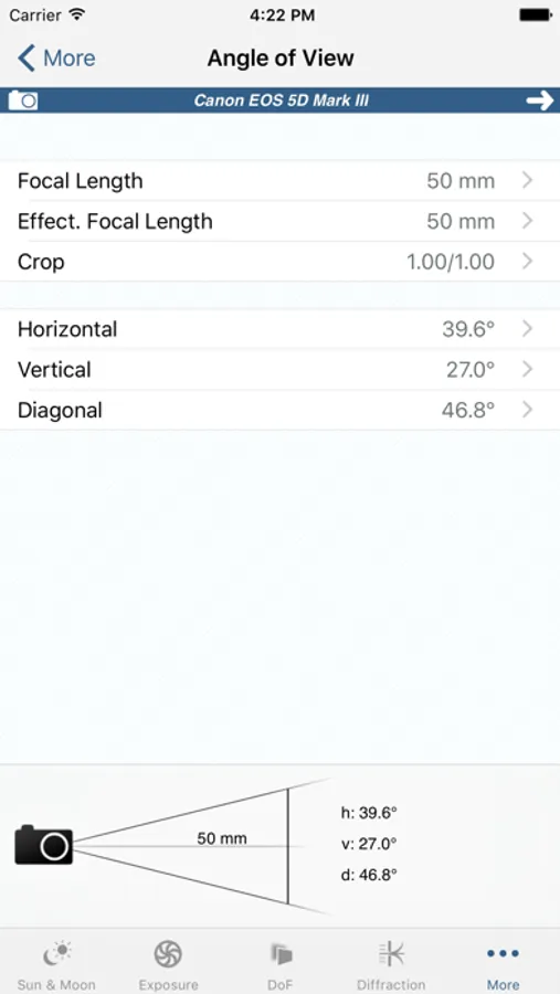 - Database of digital SLRs for simple setup (if your camera is not listed, you can simply choose the film size)