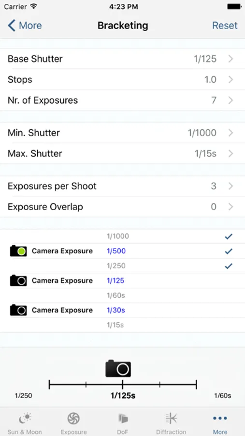 - Calculate exposure changes (f-number / shutter / iso) based on the reciprocity law