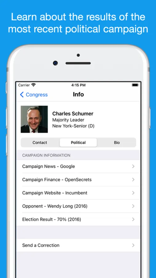 This application offers all of the vital information you need to be an active and informed citizen between elections. Learn all about who represents you in Congress, contact them in Washington, follow their campaigns and challengers, read their social networking pages, and see their YouTube videos. Share any link in the application via email, Facebook, or Twitter.