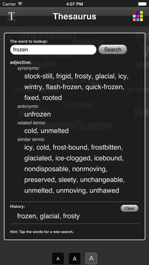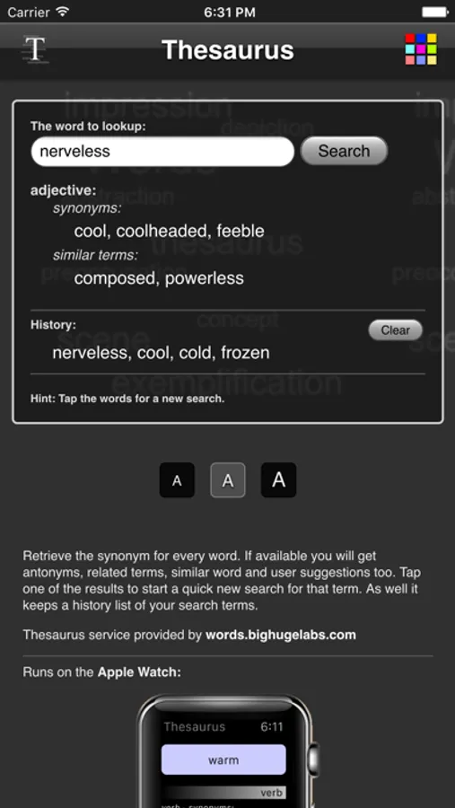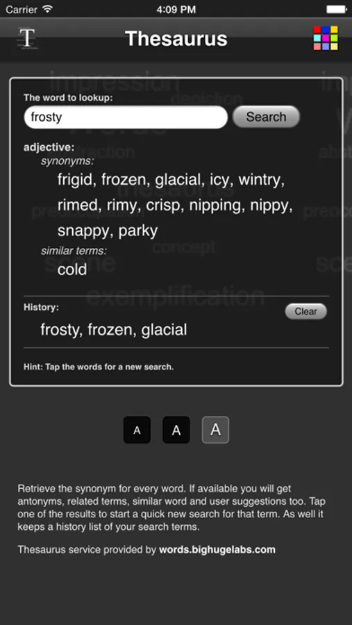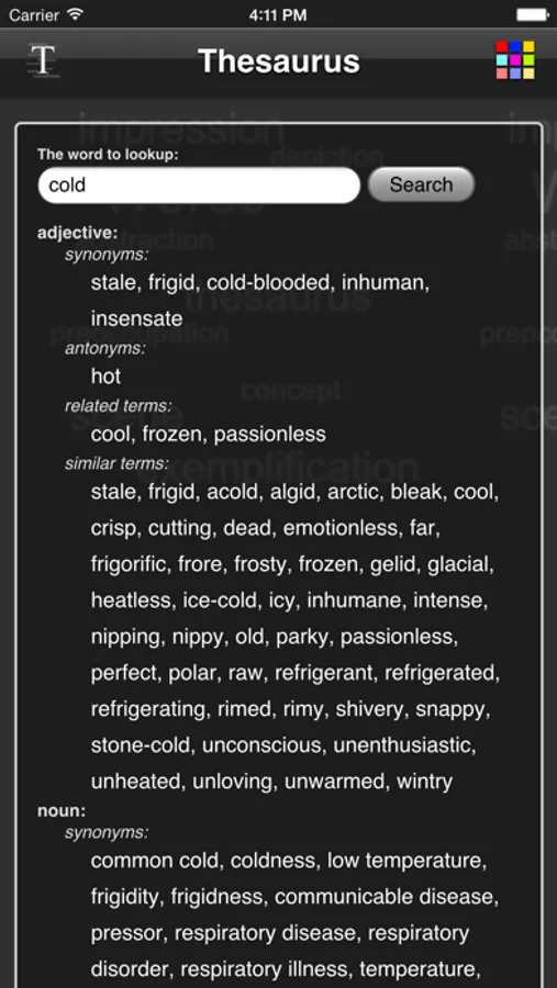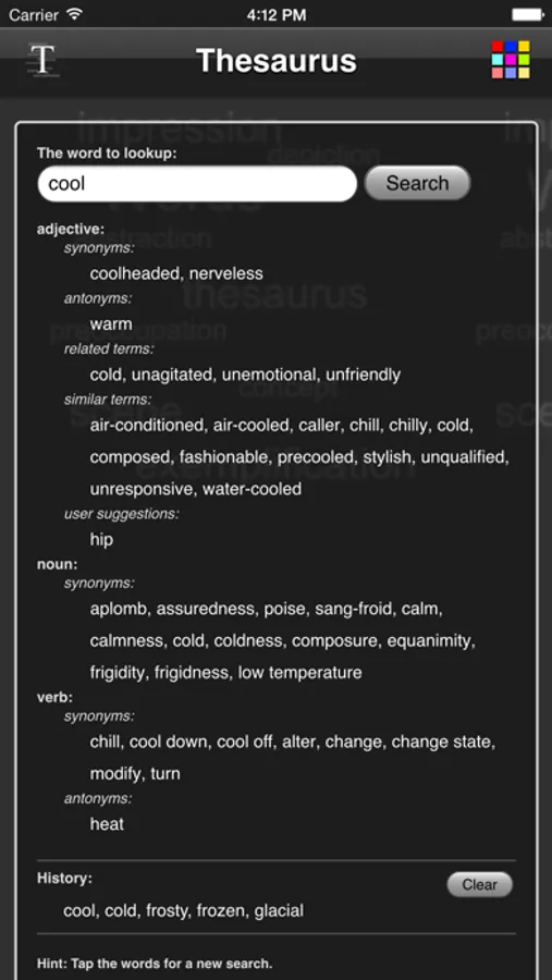 Retrieve the synonym for every word. If available you will get antonyms, related terms, similar word and user suggestions too. Tap one of the results to start a quick new search for that term. It keeps a history list of your search terms as well.