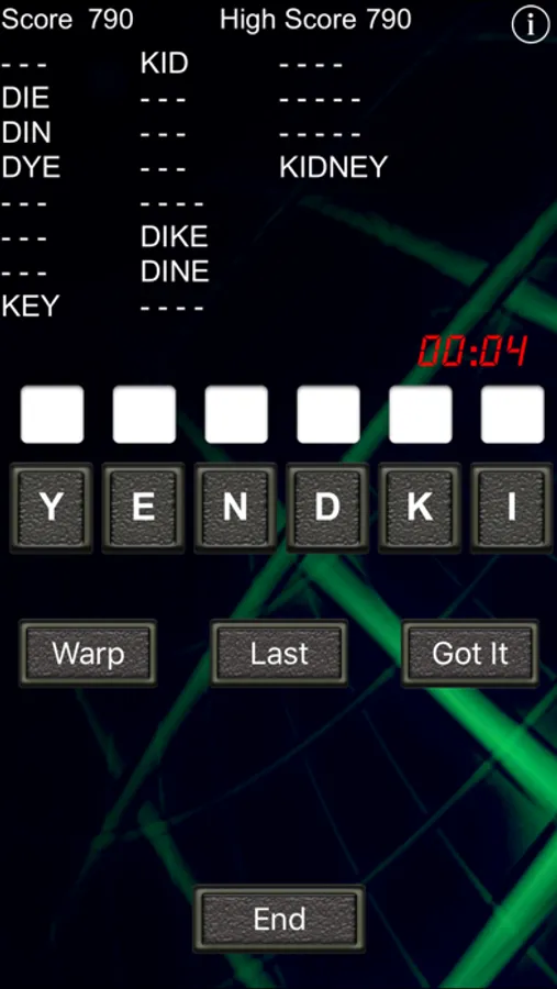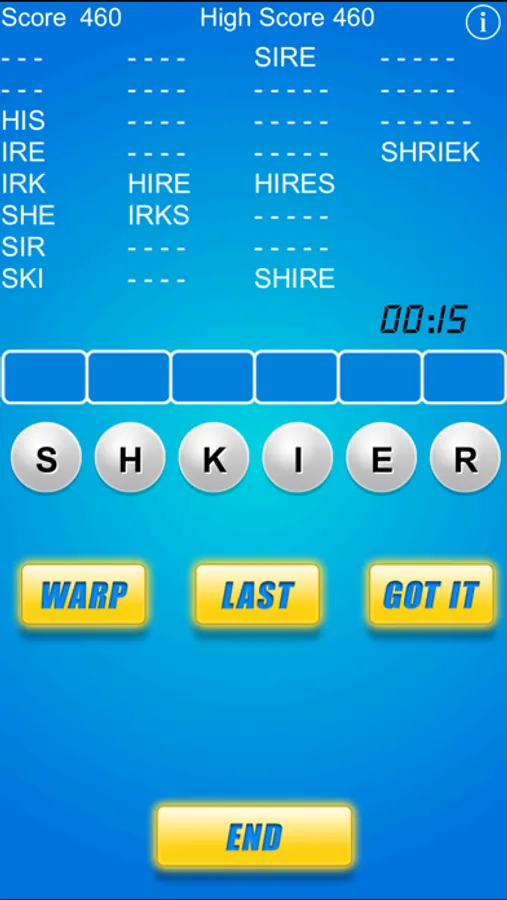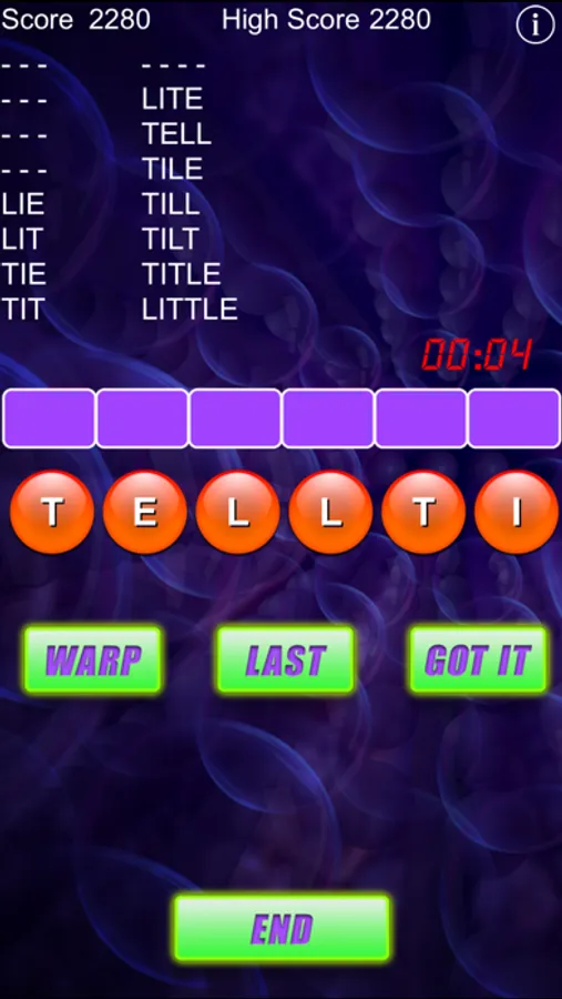 In Word Warp, you are given 6 letters for each round that you may scramble (or "warp"). For each correct word, you will receive 10 points for each letter in the word. Complete all the words in each round to receive an additional bonus of 10 points per word! How many rounds can you complete before it's game over?