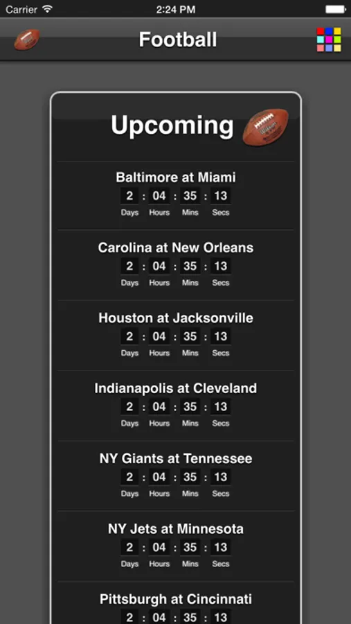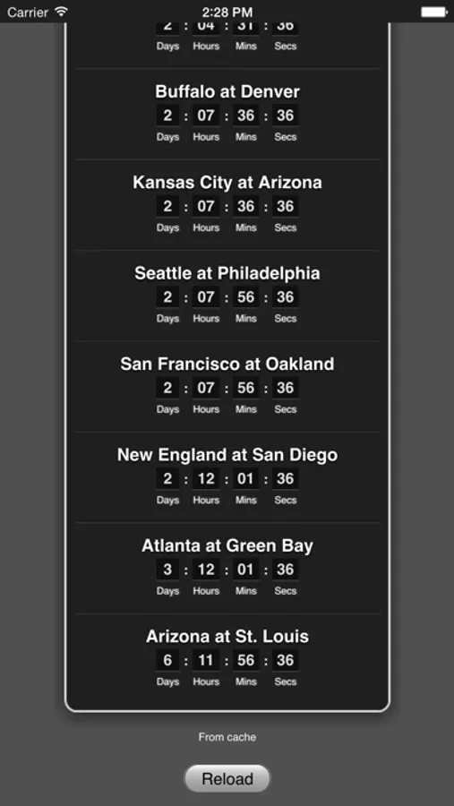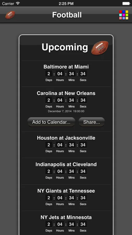 See the schedule and countdown to the current and upcoming NFL football games. Works offline with cached calendar data.