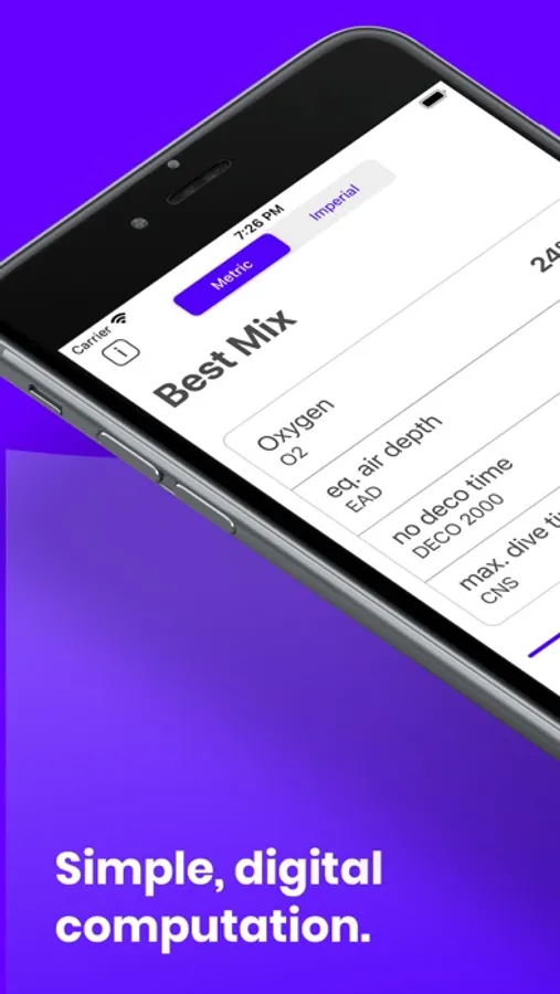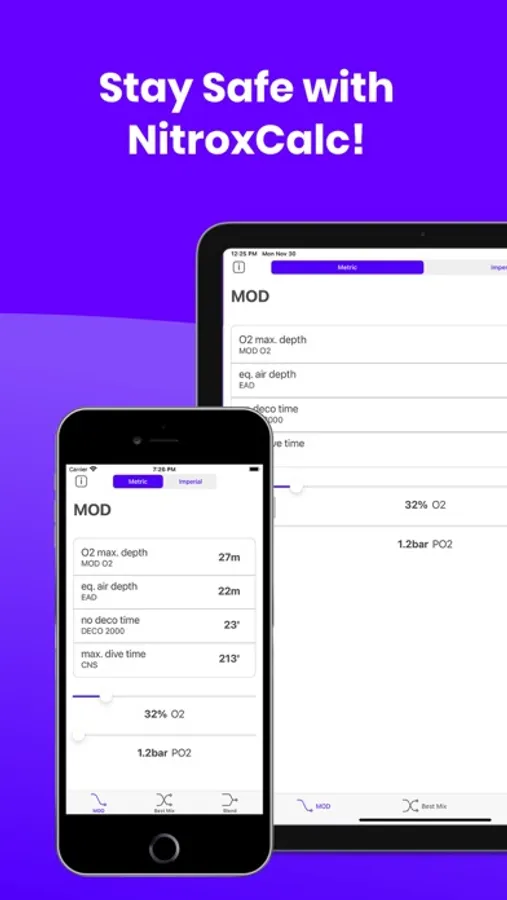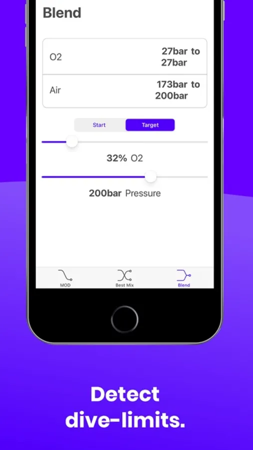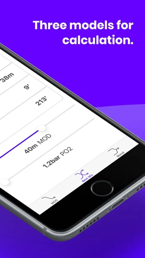 Doing your calculations by hand are a thing of the past! Our app is ideal for divers who want straightforward operation and fast calculations. With the control via a simple slider, calculations according to the MOD, Best Mix and Blend models can be performed in real time. At any time, you can switch between imperial and metric units.