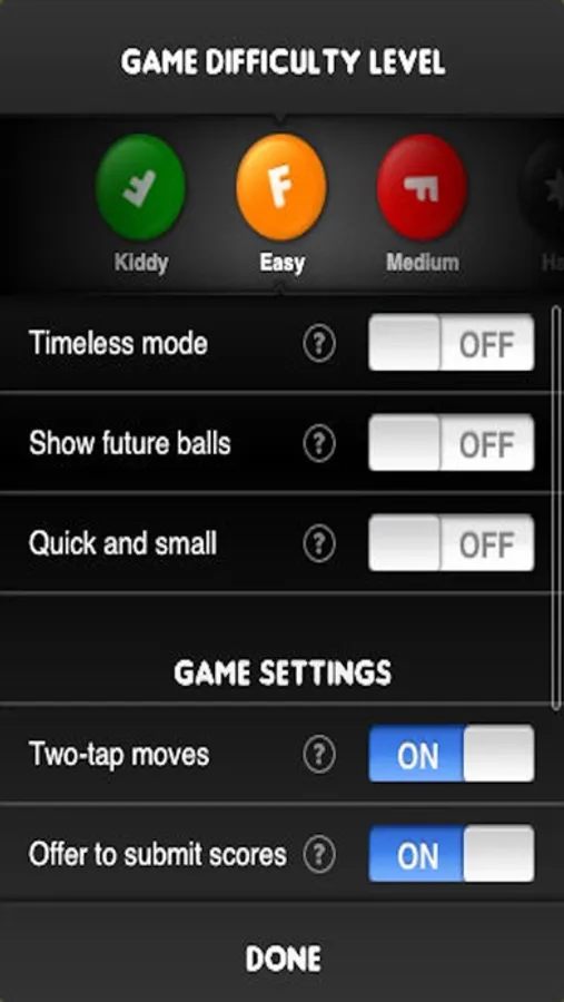 * four difficulty levels for many hours of enjoyment, including a 'quick' mode for a super-quick game when you just have a few minutes (note, in this Lite version you are limited to 400 points in only the easy mode)