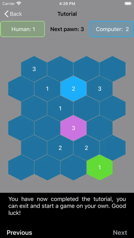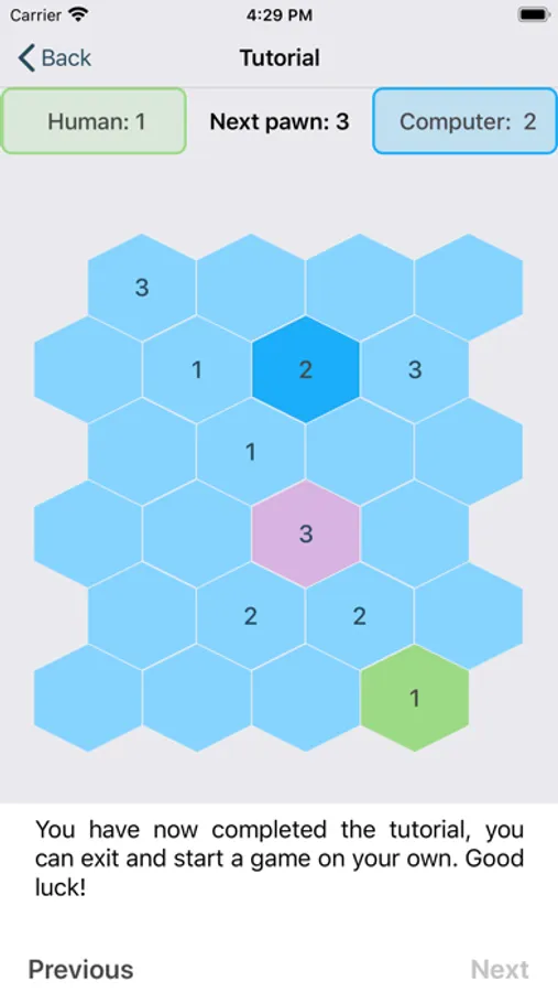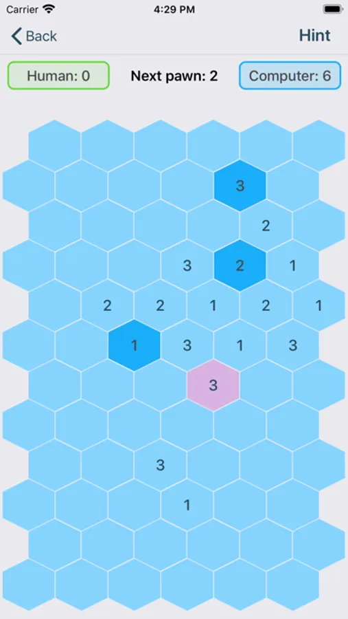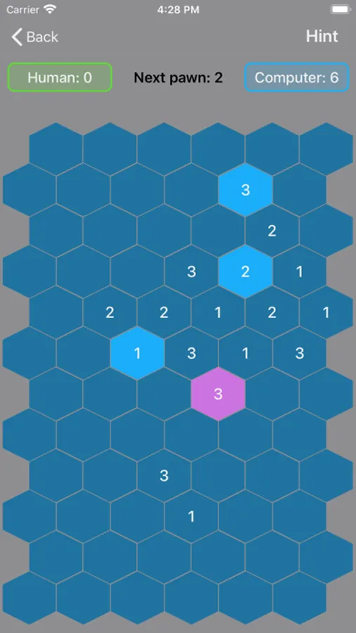 A new game starts with the number 3 in the middle of an hexagonal board. The objective is to complete 1-2-3 series either vertically or diagonally. You and the iPhone/iPod touch will play each in turn the numbers in the order 1-2-3-1-2-3... The number completing a 1-2-3 series will be added to your score, hopefully a 3. Once a number has been used to score a 1-2-3 series, it will be highlighted and neither player will be able to reuse it.