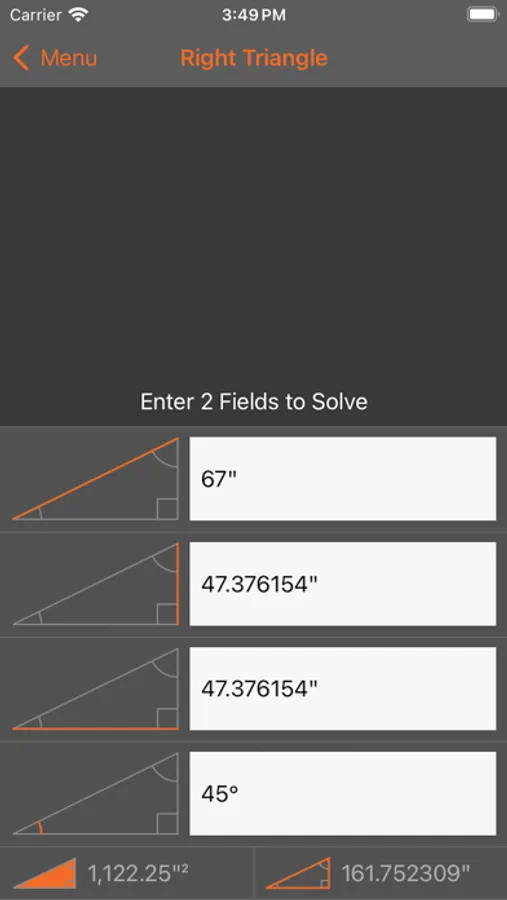 To make this convenient Right Angle supports entry of lengths in metric or imperial units. When in imperial mode entry and output can be in feet, inches with decimal or inches with fractions. In metric mode meters, centimeters, and millimeters. Angles can be entered or calculated in degrees, radian, degrees minutes seconds, % grade, x over 12.