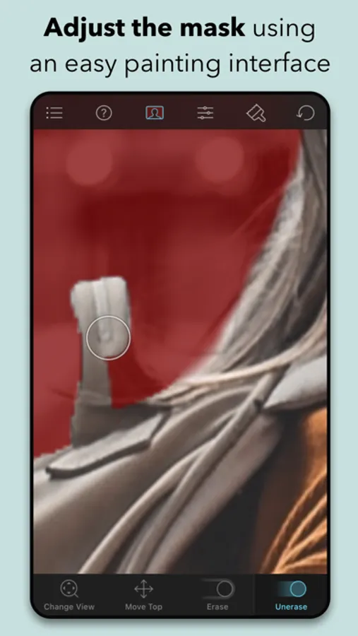 - The "red mask" view mode shows you just the top image with the erased parts in red. It is helpful when precisely cutting out an element.