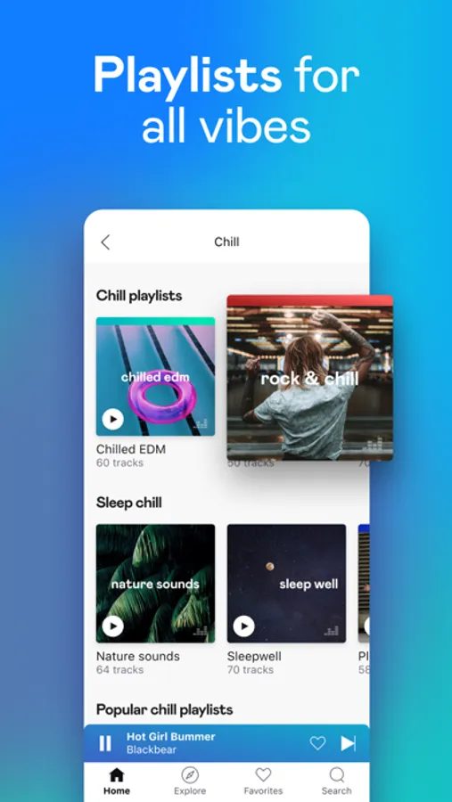 Discover and create playlists in your favorite genres: hip hop, rap, rock, lofi.