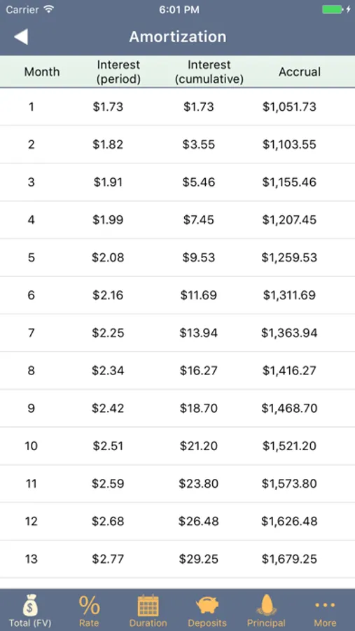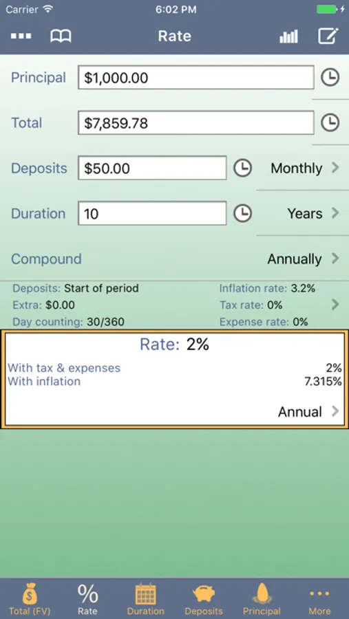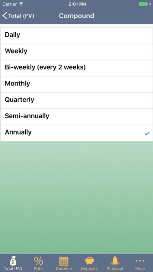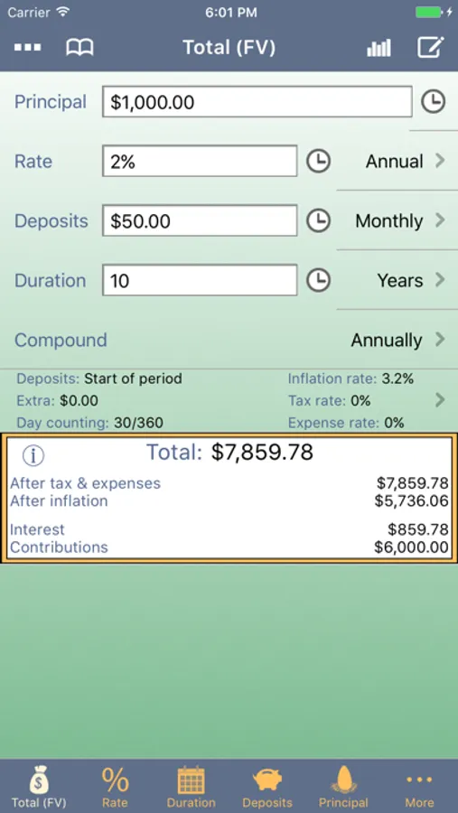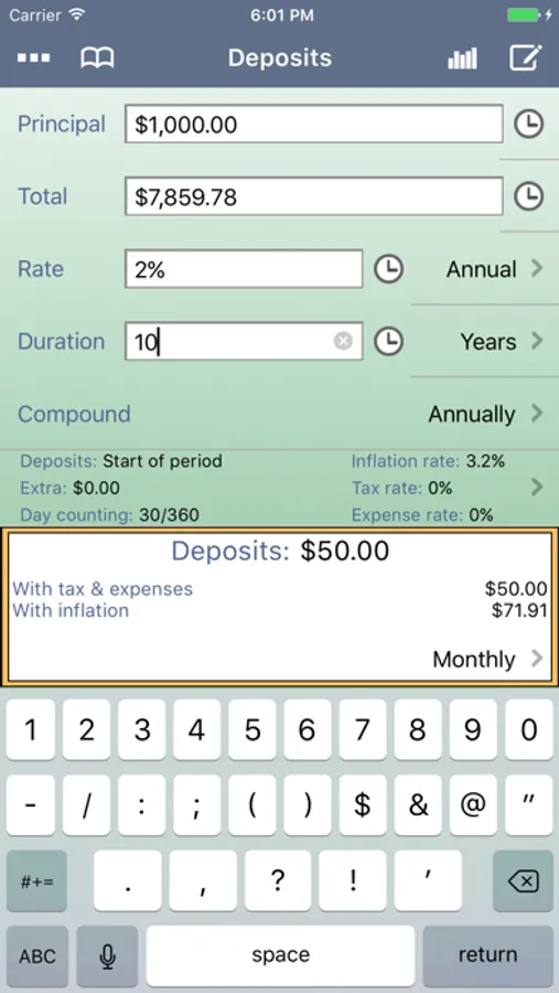 When you have Compoundee on your iPhone, those types of questions are answered. In no time at all, you’ll have the answer to how much an investment will be worth over a specific period of time, know what the necessary rate would be and the amount to make your periodic deposits in order to reach your time and money goals.