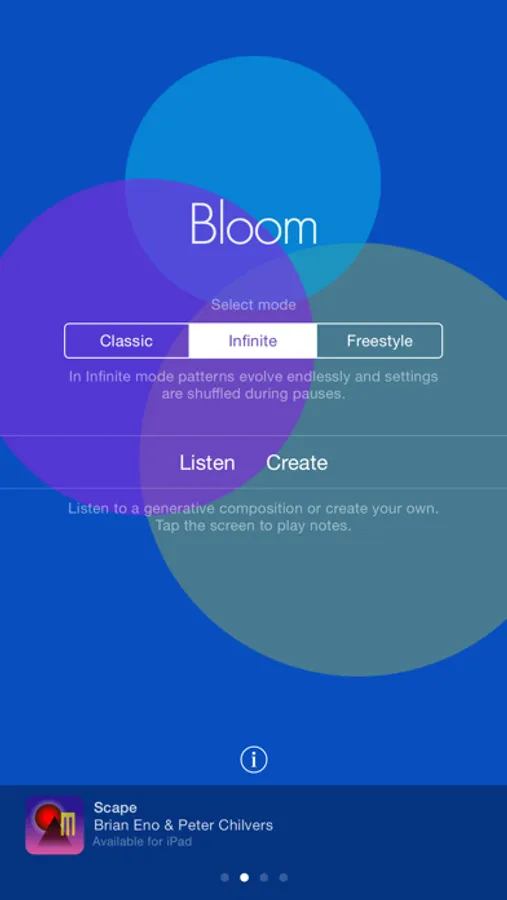 Developed by ambient pioneer Brian Eno and musician / software designer Peter Chilvers, Bloom explores uncharted territory in the realm of applications for the iPhone and iPod touch. Part instrument, part composition and part artwork, Bloom's innovative controls allow anyone to create elaborate patterns and unique melodies by simply tapping the screen. A generative music player takes over when Bloom is left idle, creating an infinite selection of compositions and their accompanying visualisations.