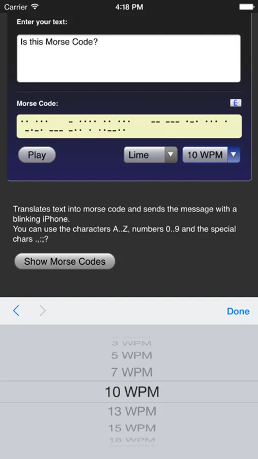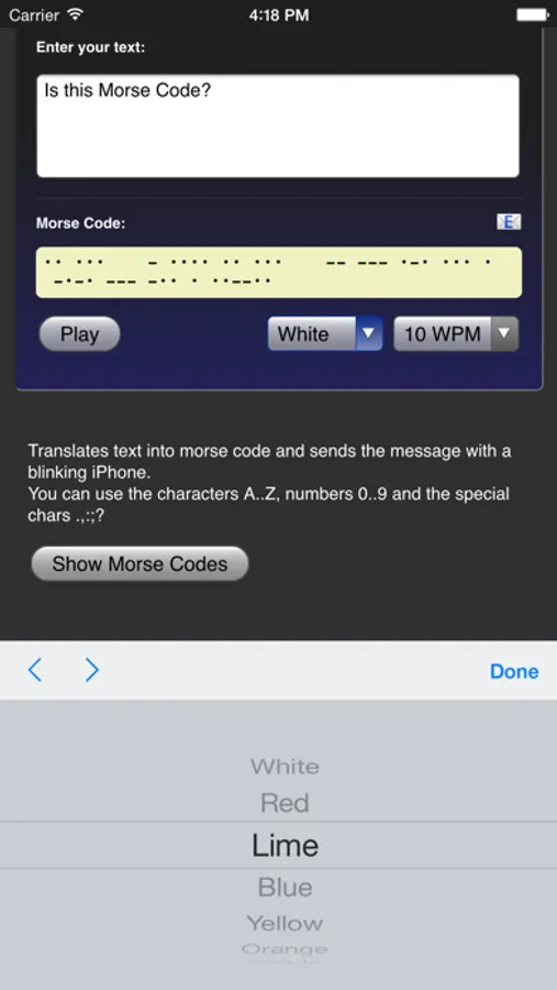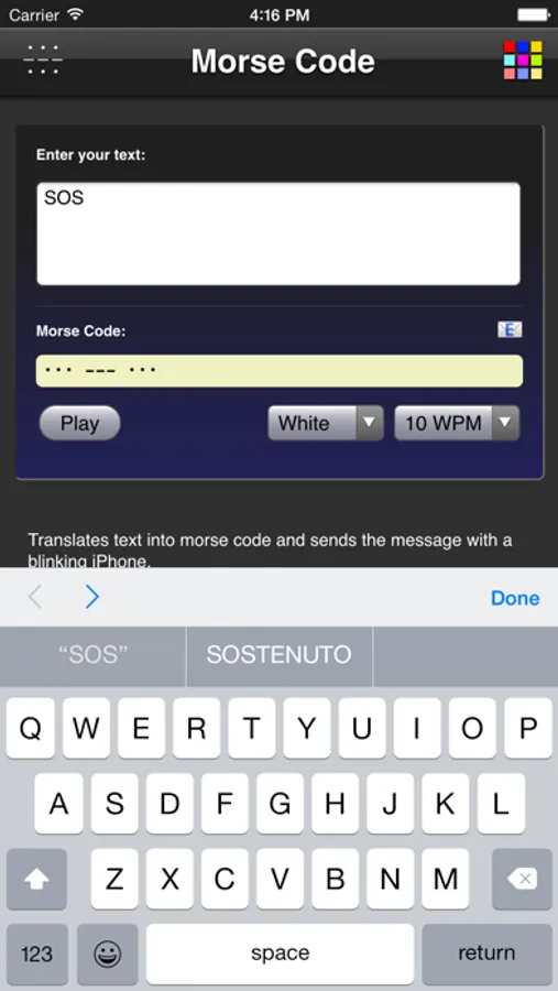 Translates text into morse code and sends the message with a blinking iPhone. The speed (WPM) and the color can be changed.