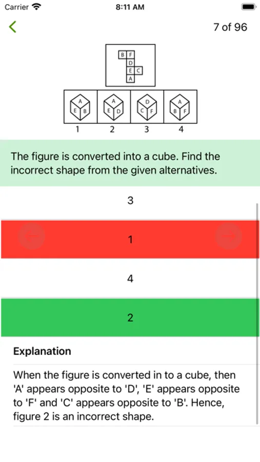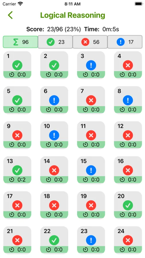 A summary of the test is presented at the end of each test. It shows you the time you took, the score, which questions you answered correctly and where you were wrong, explanation for almost every question.