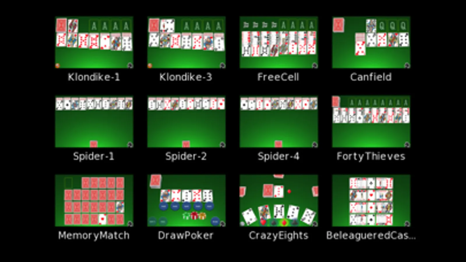 Card Shark supports Klondike Solitaire, FreeCell, Spider Solitaire, Canfield, Forty Thieves, Beleaguered Castle, Crazy Eights, Draw Poker, and Memory Match.