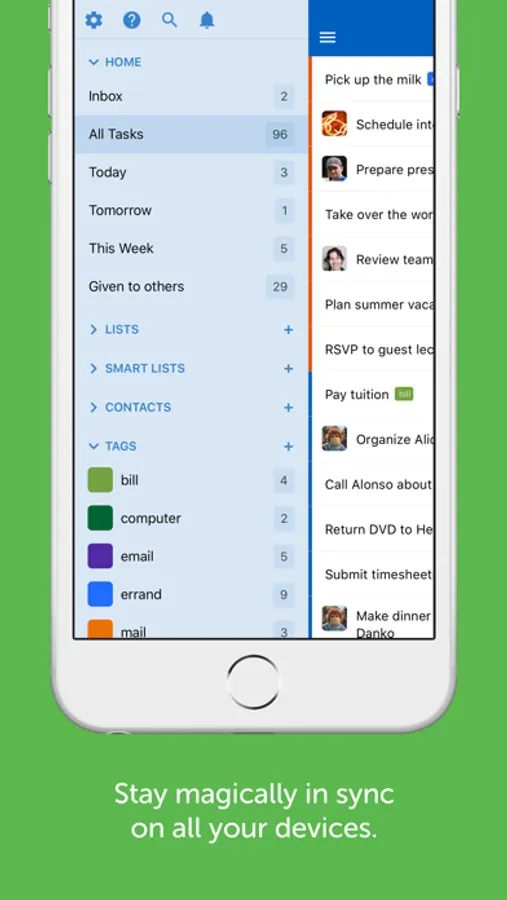 • Organize the way you want to with priorities, due dates, repeats, lists, tags, and more