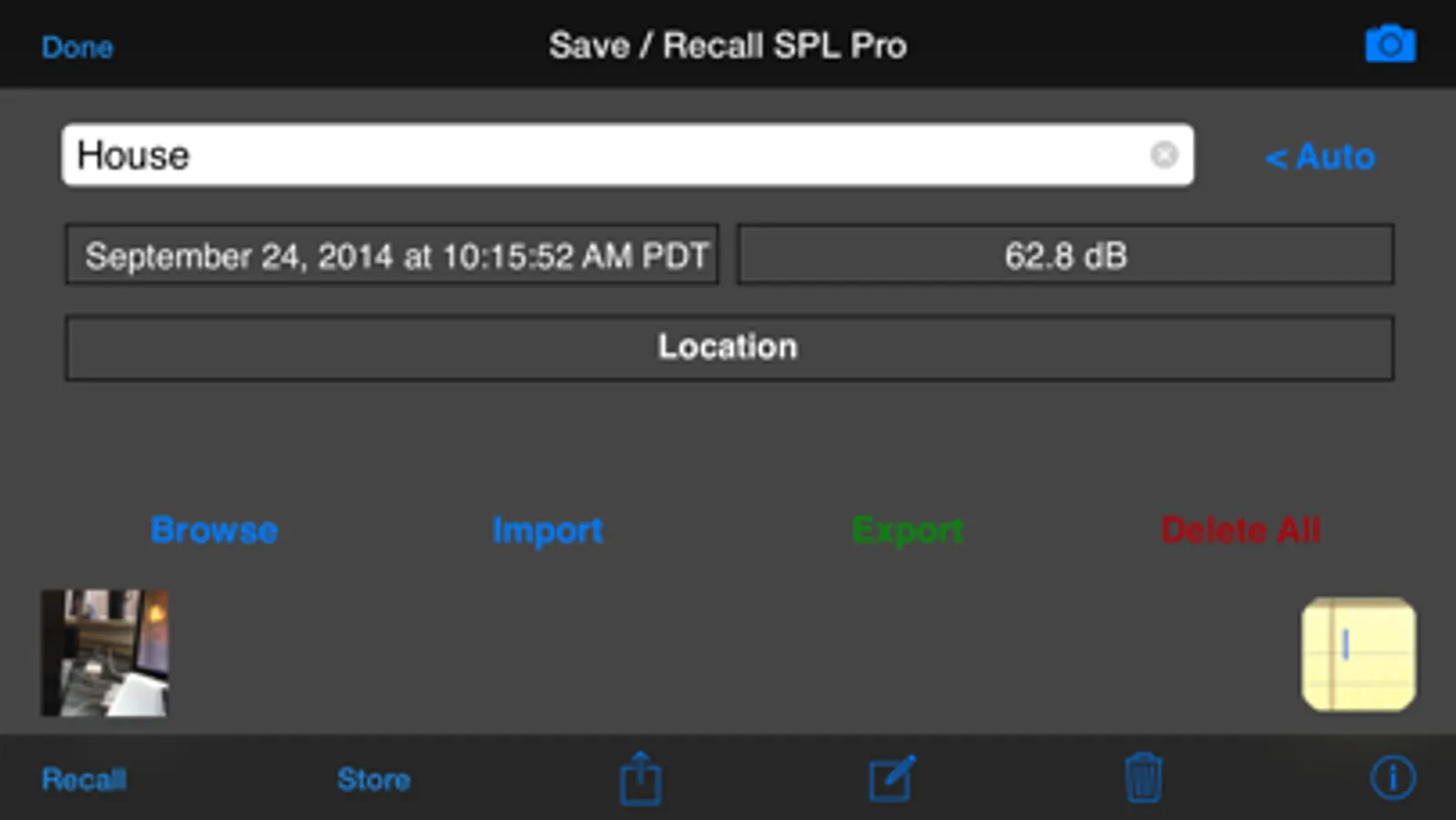 Store Results -- Uses the same powerful Save / Recall engine as our premier app, AudioTools. Allows storing GPS and time-stamped results, and exporting them to your computer.