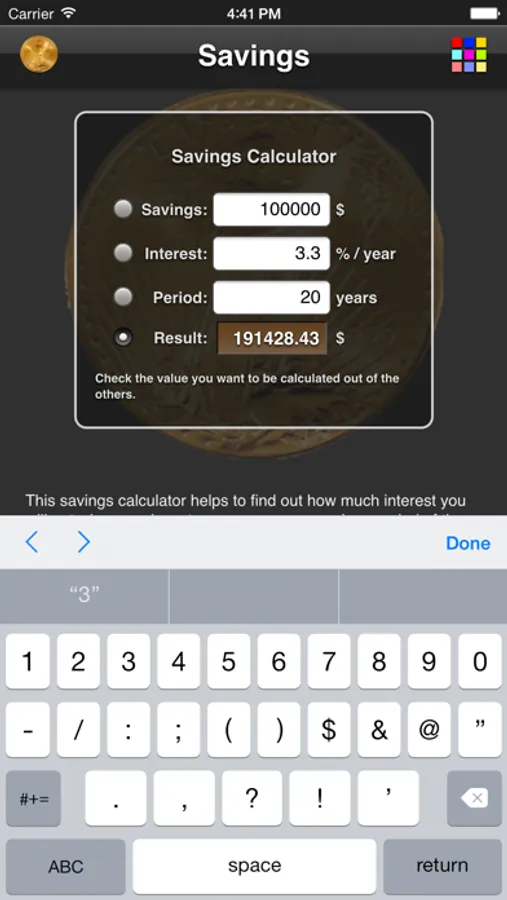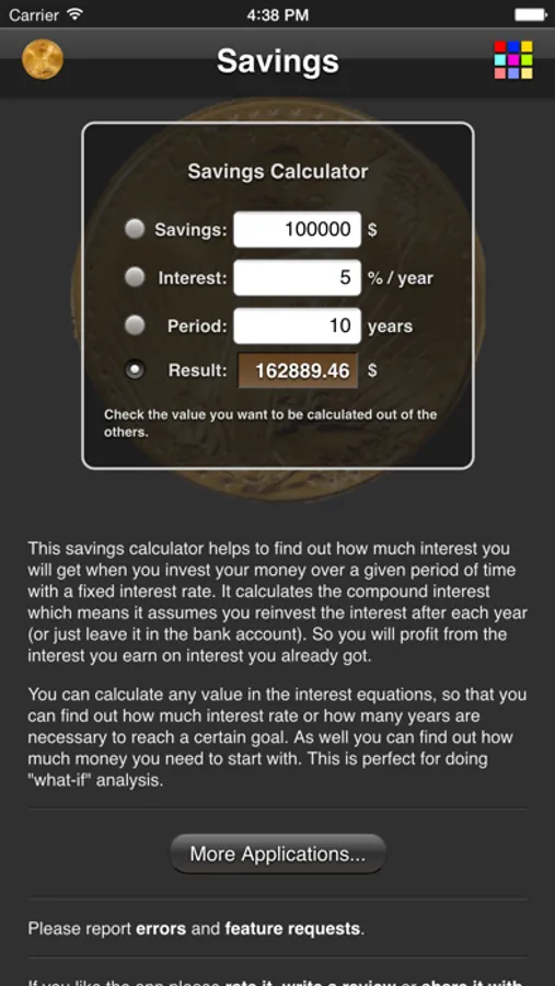 This savings calculator helps to find out how much interest you will get when you invest your money over a given period of time with a fixed interest rate. It calculates the compound interest which means it assumes you reinvest the interest after each year (or just leave it in the bank account). So you will profit from the interest you earn on interest you already got.