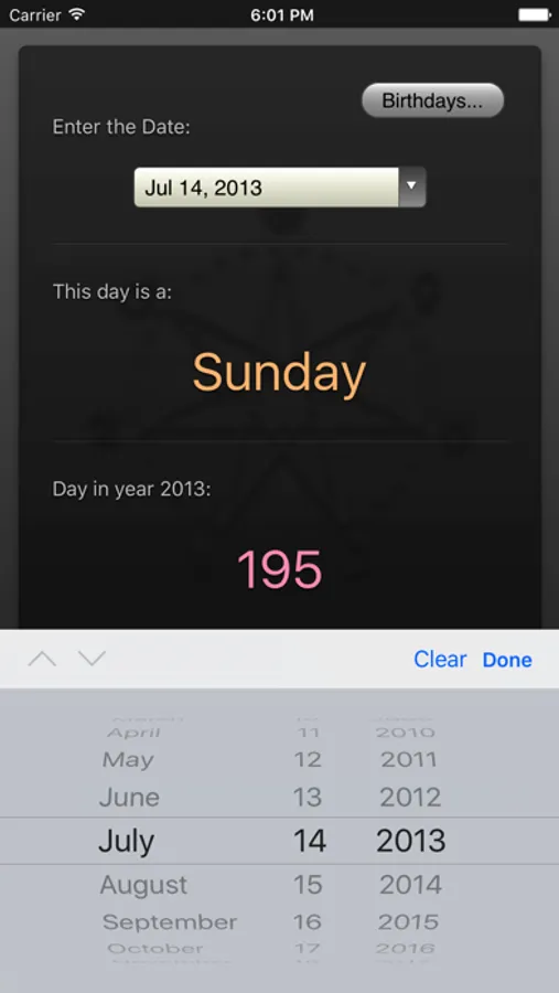 Did you always want to know which day of week you or one of your friends was born? This weekday calculator application calculates the day of the week for any date in the past and the future. It's useful to plan your holidays and trips or just find out the day of week for your next anniversary.