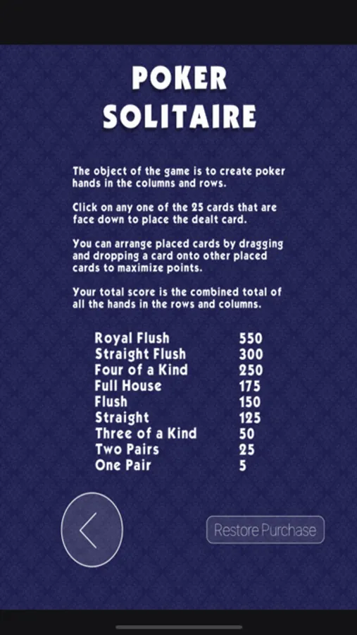 Combined with the strategy and fun of Poker with the ease of Solitaire, Poker Solitaire is a game that draws you in and keeps you playing for hours.