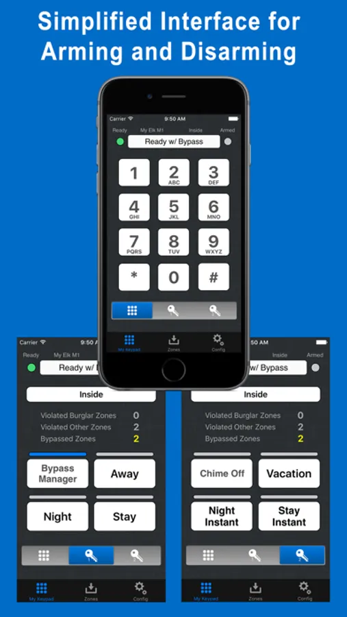 eKeypad Alarm is focused exclusively on arming, disarming and bypass functions of your M1 Gold or EZ8 system. Your system is available from your iPad, iPhone or Apple Watch. An optional add-on module allows control of an unlimited number of panels.
