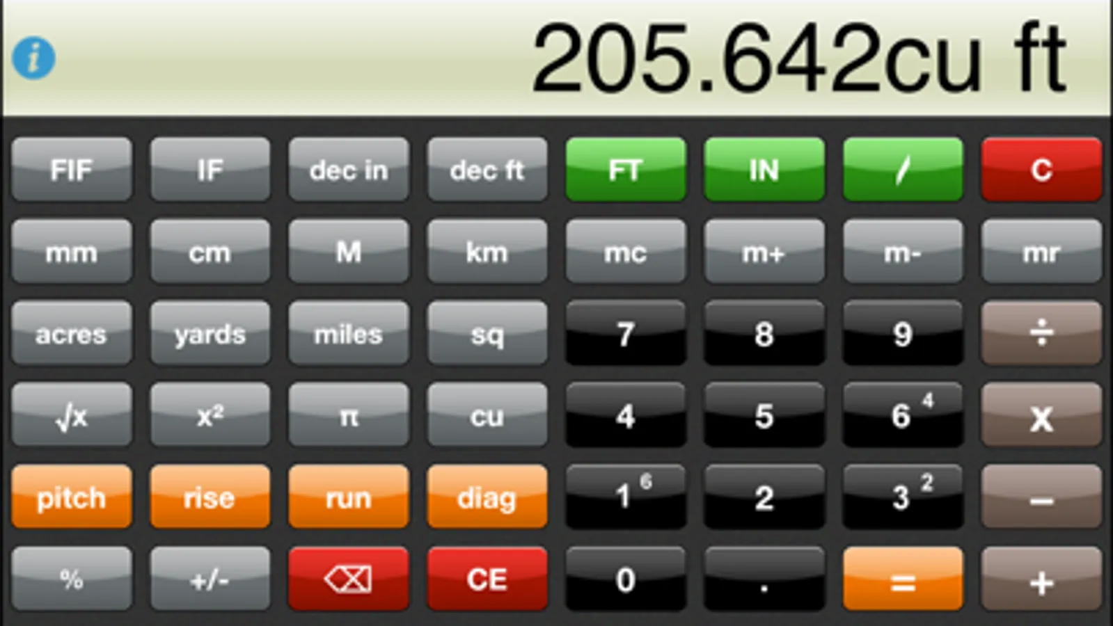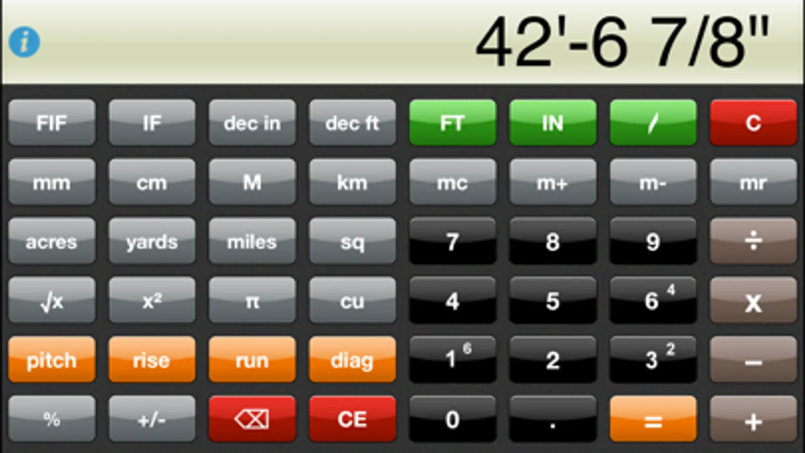 inchCALC+ is a State-of-the-Art Construction Calculator / Conversion Calculator for people who work with the FEET• INCH• FRACTION dimensions used on common rulers and tape measures.